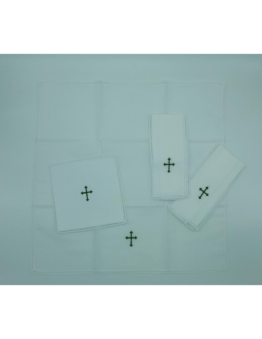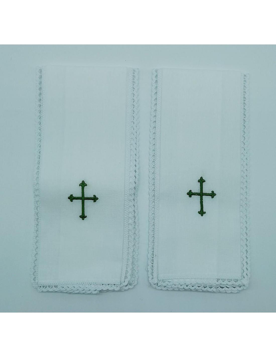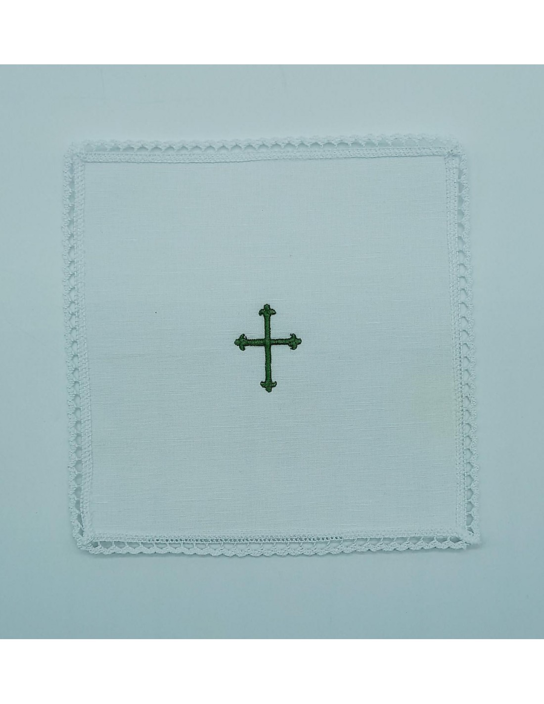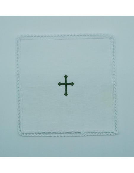 Prodotto realizzato da un ricamificio locale, con ricamo croce in verde e merletto che definisce il servizio.